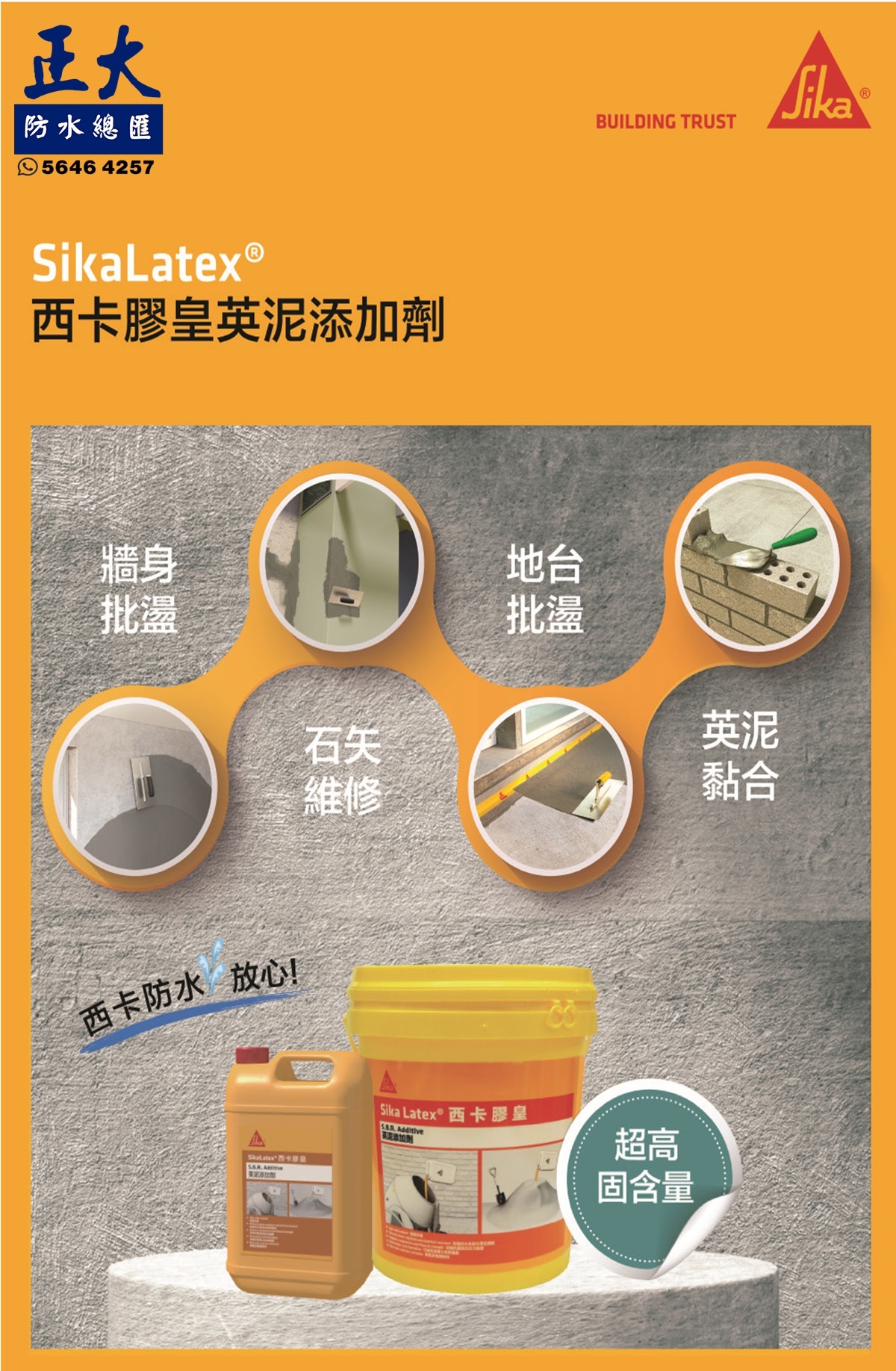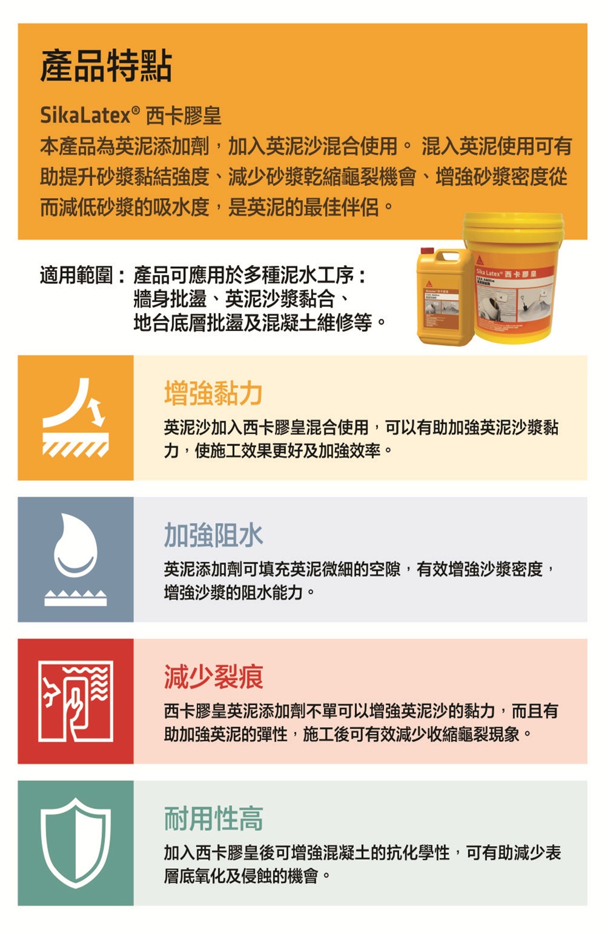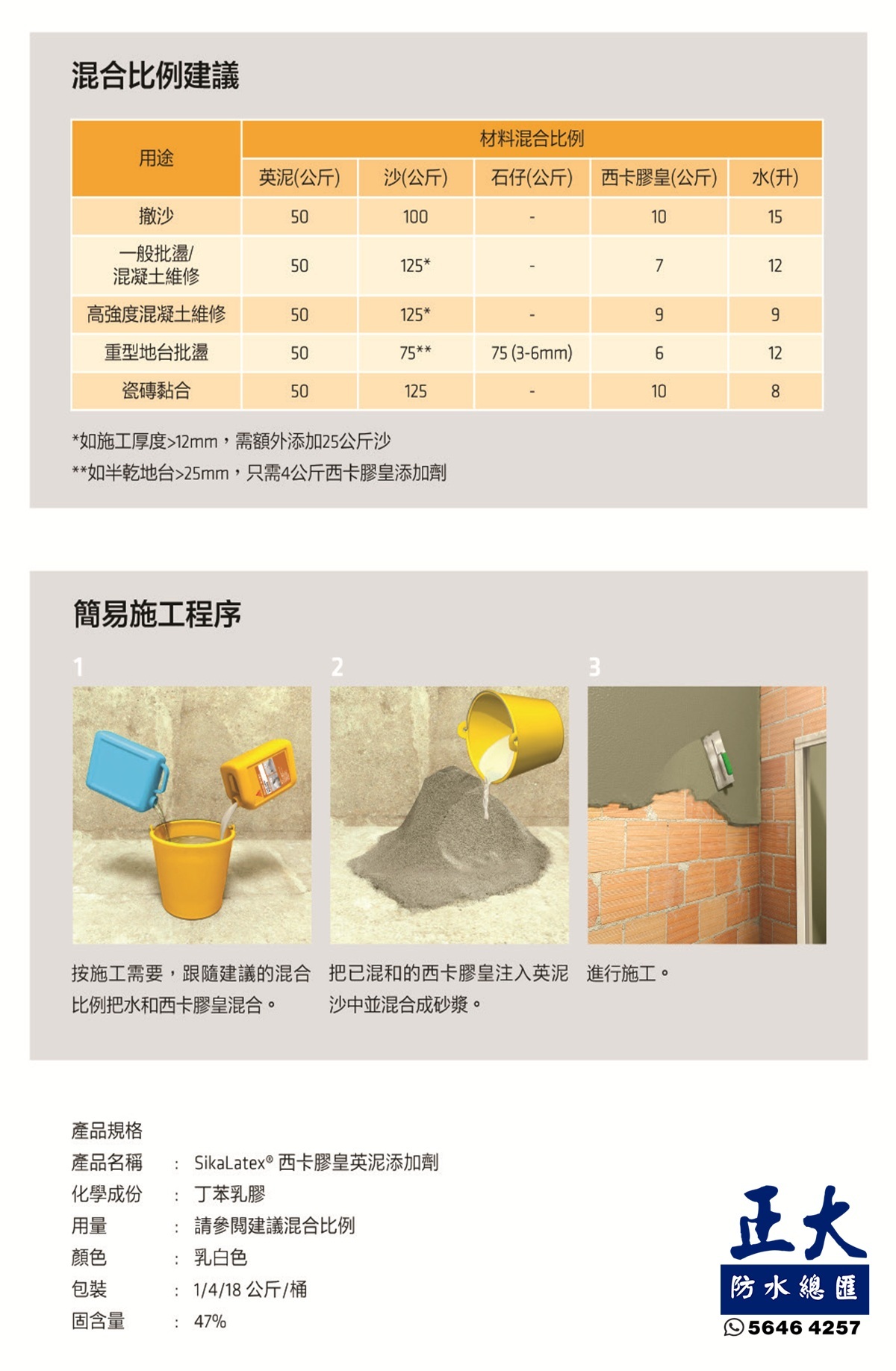 SikaLatex 西卡膠皇為英泥添加劑,加入英泥沙混合使用。混入英泥使用可有助提升砂漿黏結強度、減少砂漿乾縮龜裂機會、增強砂漿密度從而減低砂漿的吸水度,是英泥的最佳伴侶。
