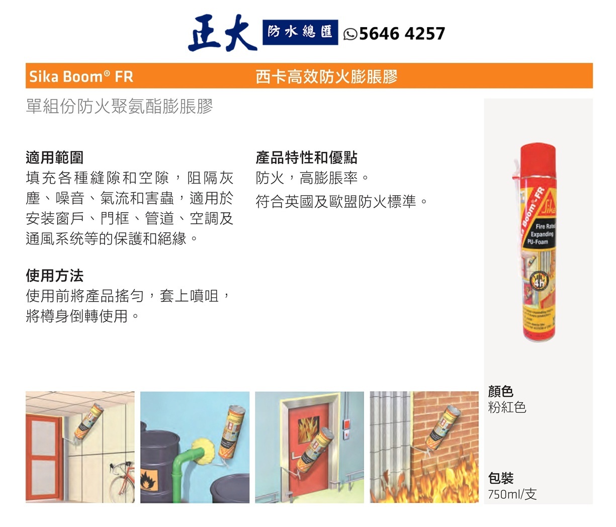 Sika Boom® FR 是一種單組分、快速固化的聚氨酯泡沫,可阻燃長達 5小時。