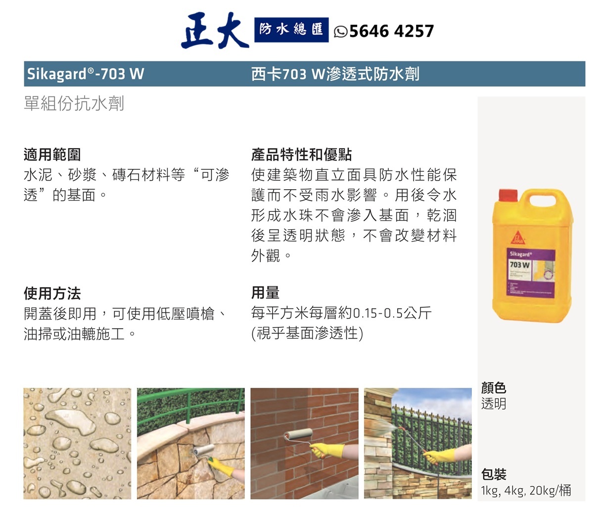 Sikagard®-703 W為一種液狀,可立即使用矽氧烷類滲入型潑水劑