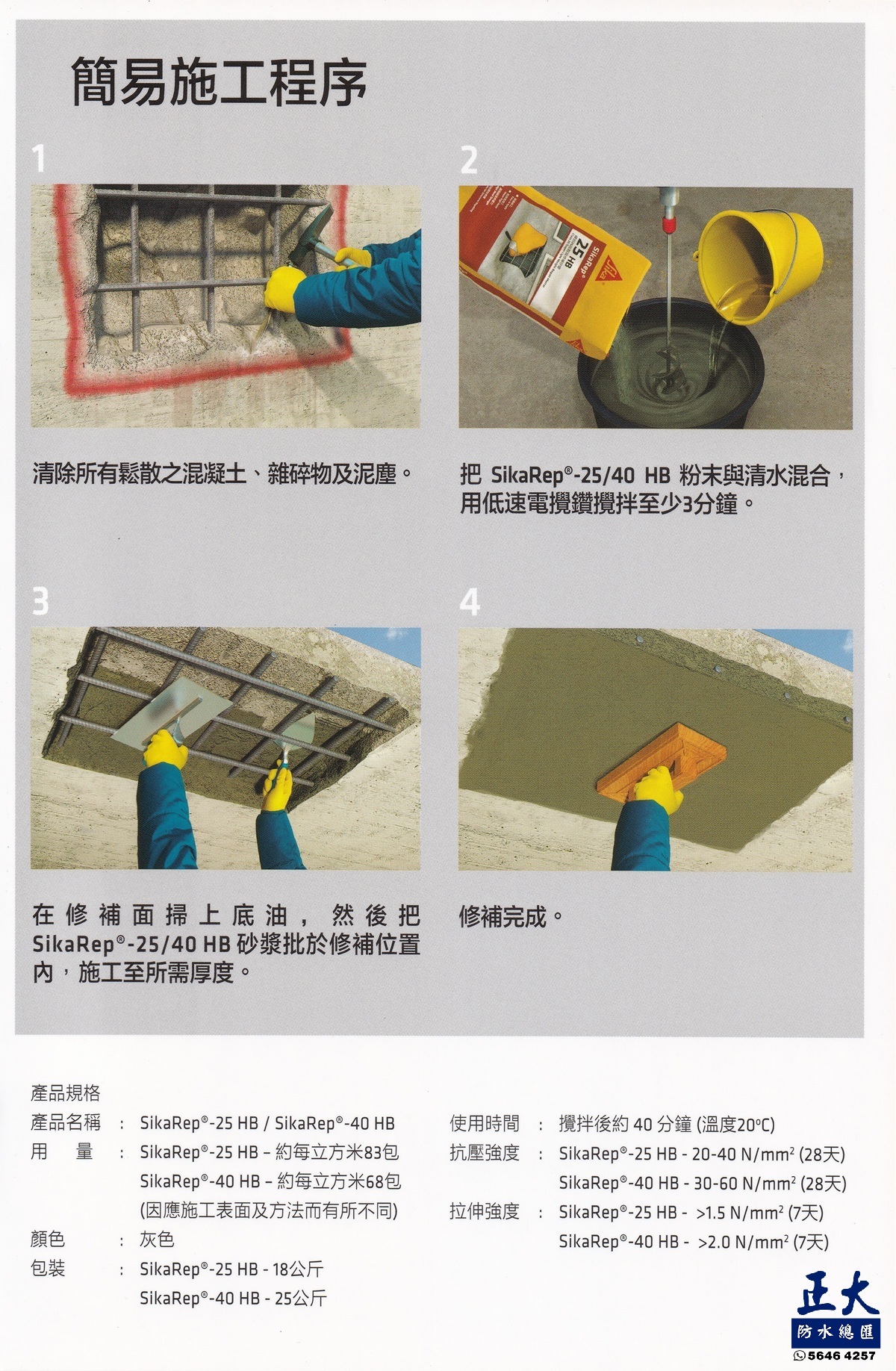 SikaRep®-40 HB,西卡25級別維修砂漿,用於修補破損或剝落的混凝土,天花牆身及室内外位置均適用。