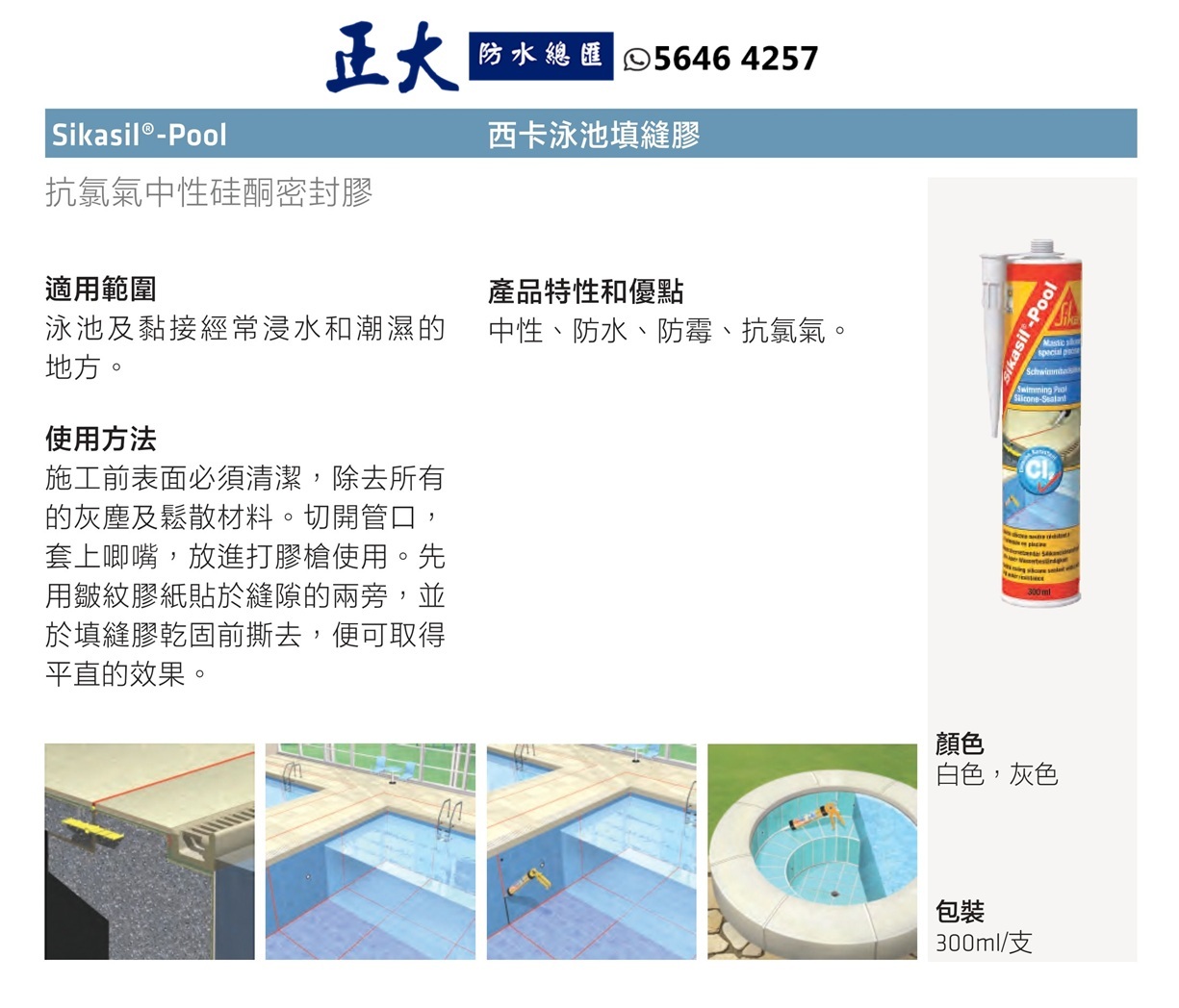 Sikasil® Pool  是一種專為游泳池、經常性潮濕區域(如淋浴間、更衣室)以及永久浸水區域設計的單組分、中性固化矽酮填縫膠。