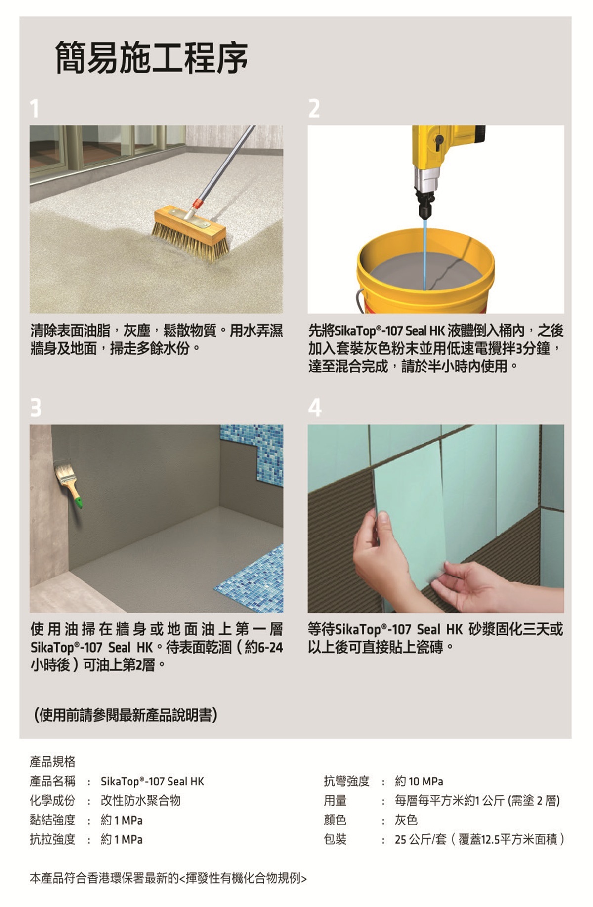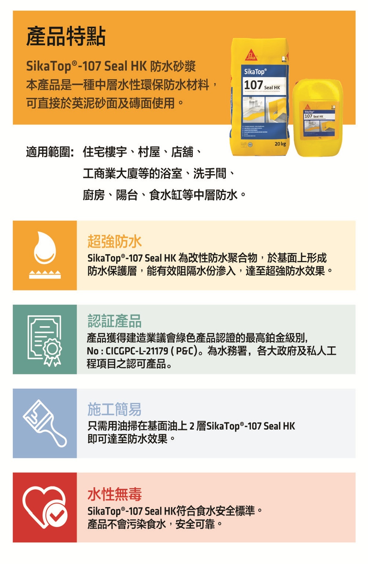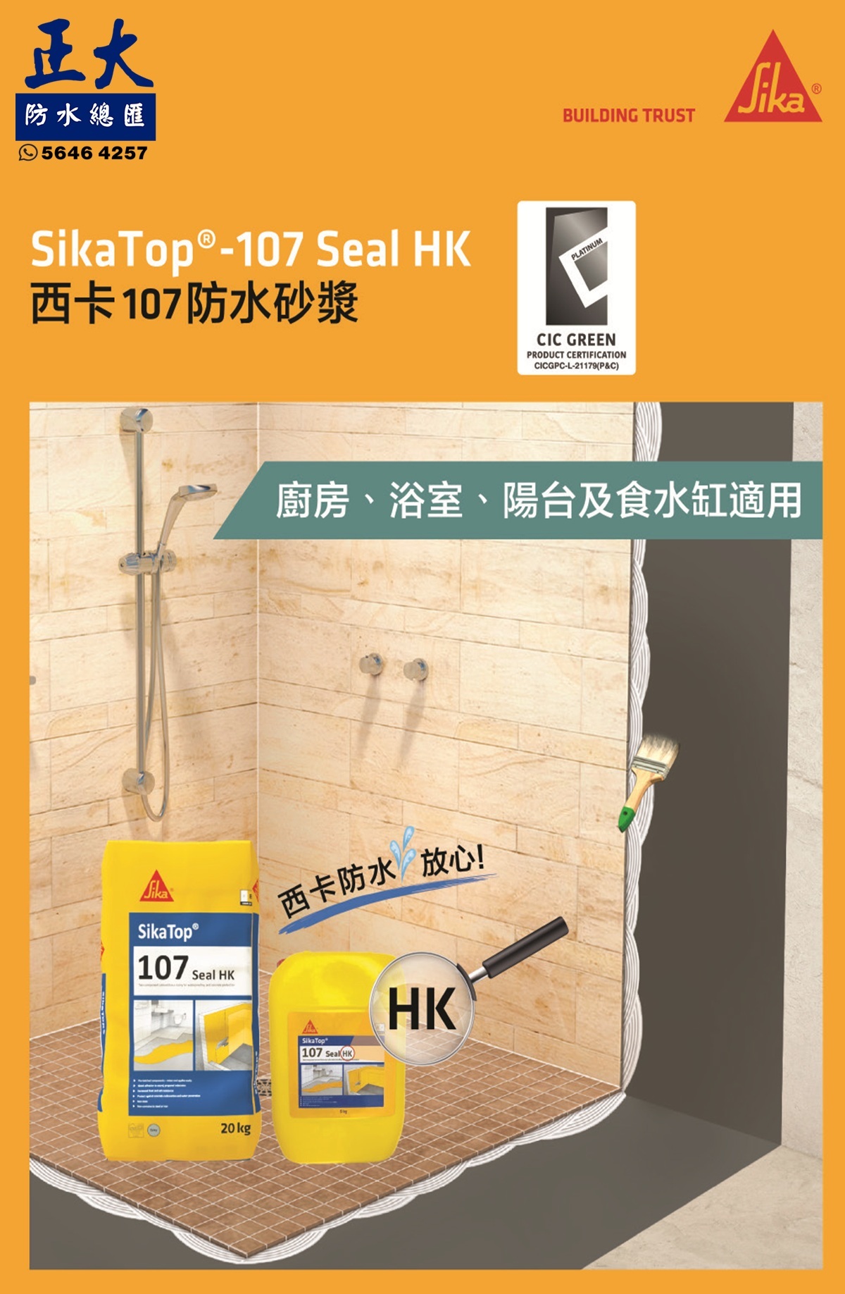 SikaTop®-107 Seal HK 聚合物水泥基防水漿料|香港潮濕氣候專用雙組份聚合物改質防水塗料,專治香港建築滲漏頑疾!預配比包裝確保品質穩定,抗滲透壓強度>1.5MPa,中層防水物料,可以用於天台、地下室、泳池、洗手間、浴室、廚房。此可以長期浸水。
