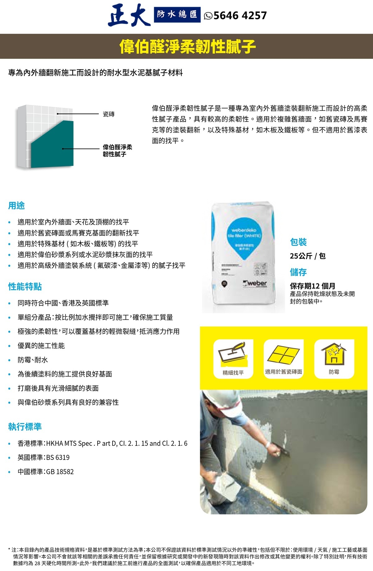 Weberdeko tile filler (前稱: EMIX Tile Filler) 是一種特殊混合的柔性預拌粉末,適用於翻新工程的薄層抹灰。它可用於舊瓷磚和其他基材。此抹灰材質防水,適用於乾燥或潮濕的室內外環境。