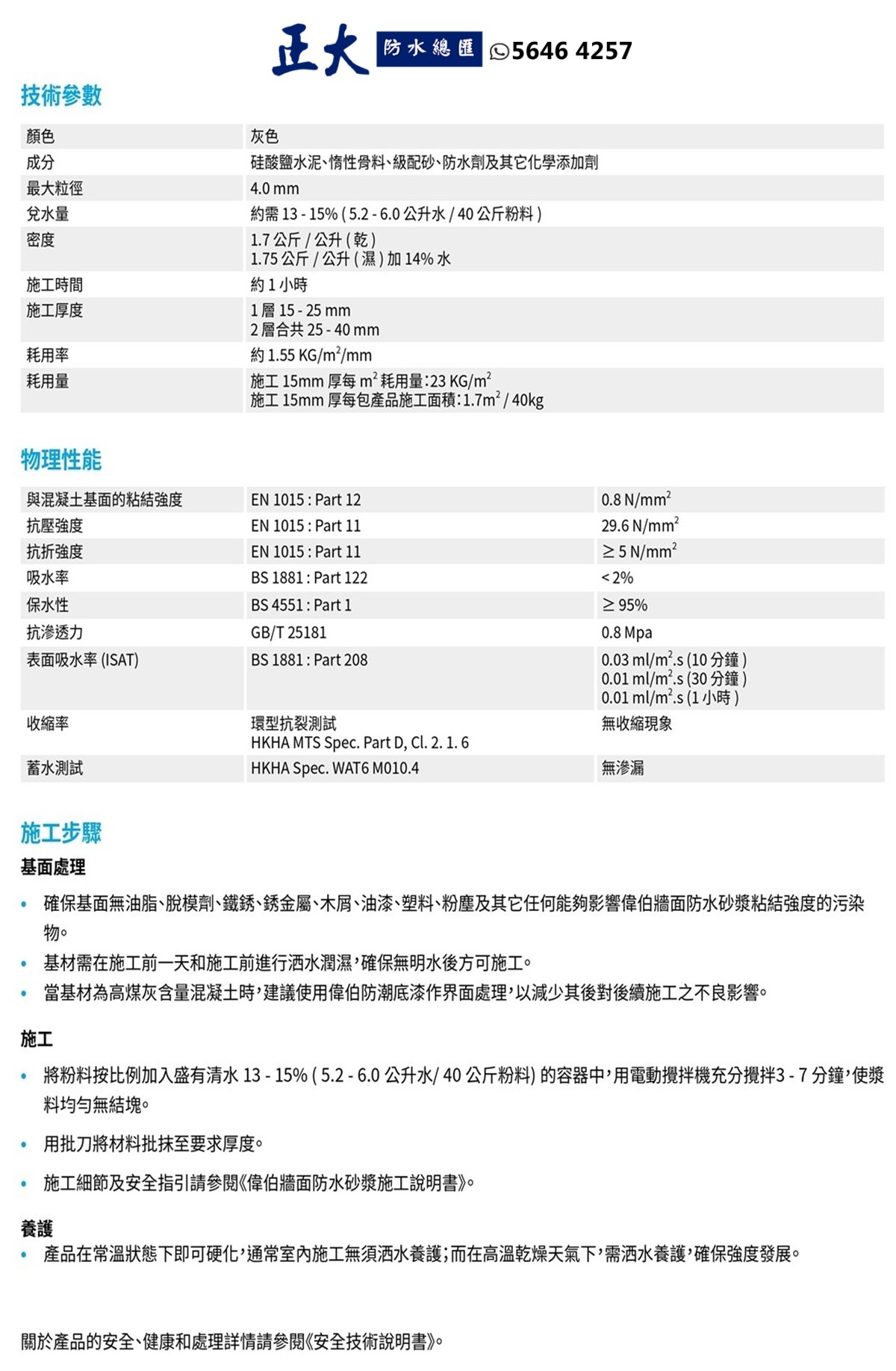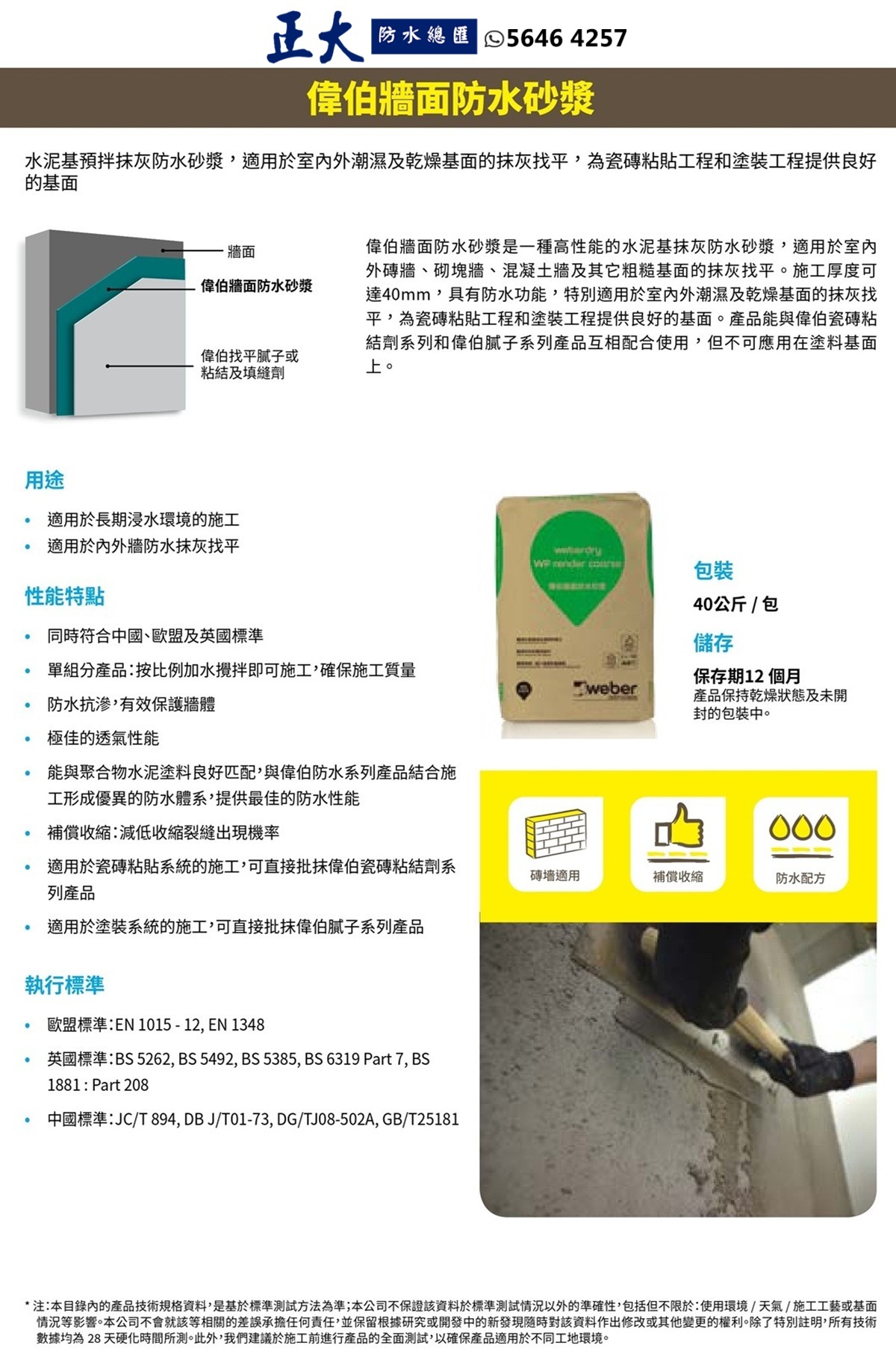 Weberdry WP render coarse(前稱: EMIX WP Render Coarse) 是一種特殊的水泥基防水抹灰材料,適用於磚牆、砌塊牆和混凝土表面。施工厚度可達40 mm,具有防水功能,特別適用於室內外潮濕及乾燥基面的抹灰找平,為瓷磚粘貼工程和塗裝工程提供良好的基面。