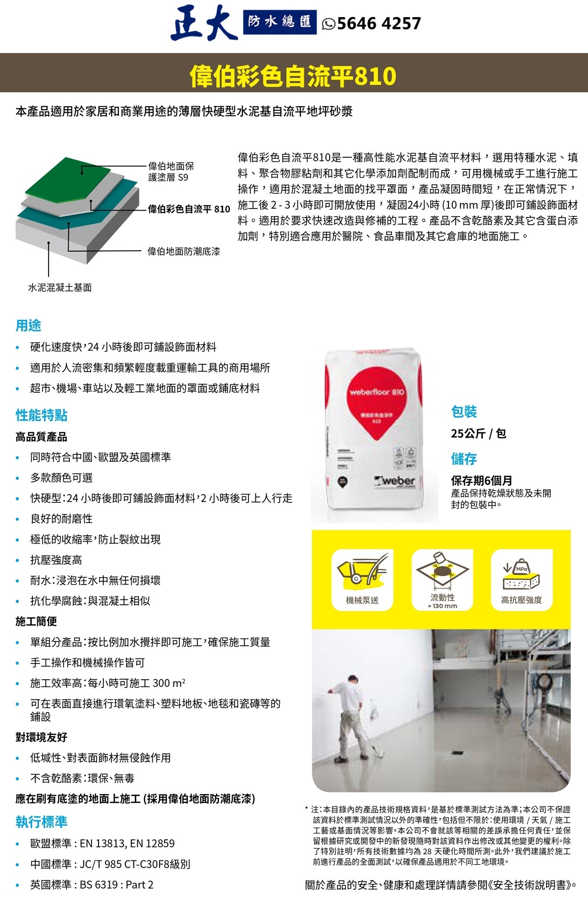 Weberfloor 810 (前稱: EMIX Flowment 810) weberfloor 810 是一種可機洗或手工施工的自流平地面鋪裝系統。它由特殊的淺色水泥和輔助黏合劑以及顏料配製而成,可提供多種顏色選擇。在正常情況下,施工後 1 - 3 小時即可開放使用,凝固 1-3 天 (10 mm 厚) 後即可鋪設飾面材料。