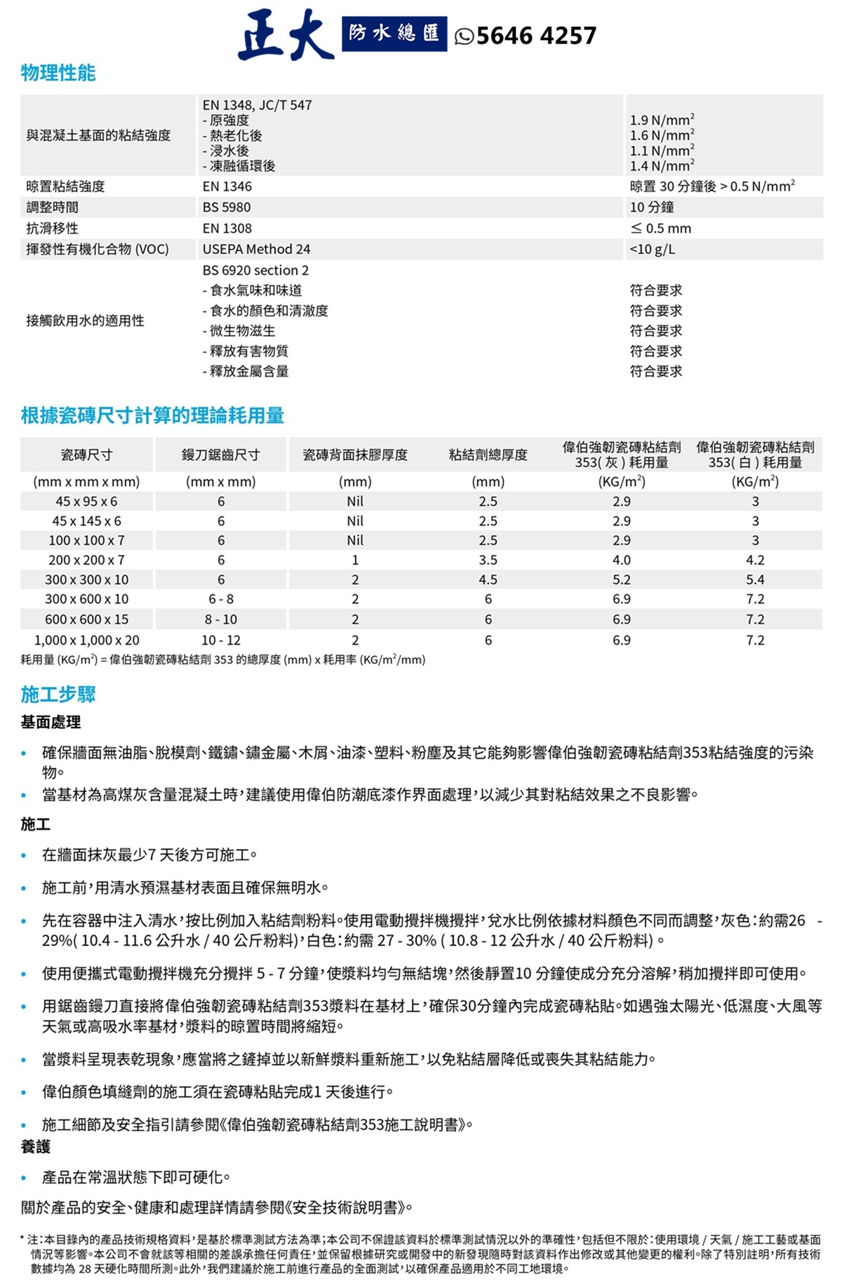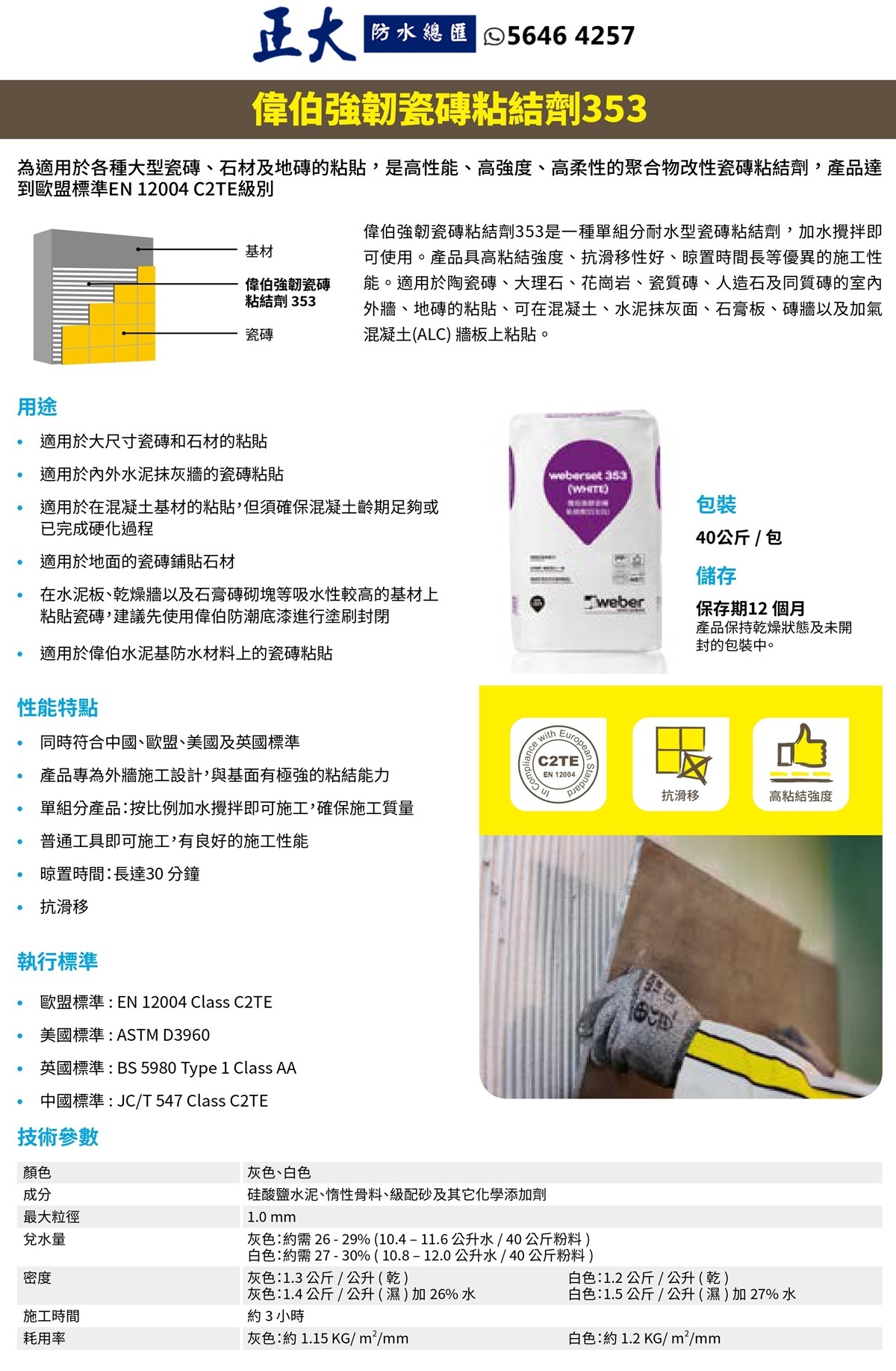 Weberset 353 (前稱︰ EMIX Tile Fix 353 ) 是一款高強度、高性能、水泥基、防水的單組分瓷磚黏合劑。只需加水即可輕鬆混合,形成強度高、防滑、開放時間長且易於施工的黏合砂漿,適用於室內外各種應用。